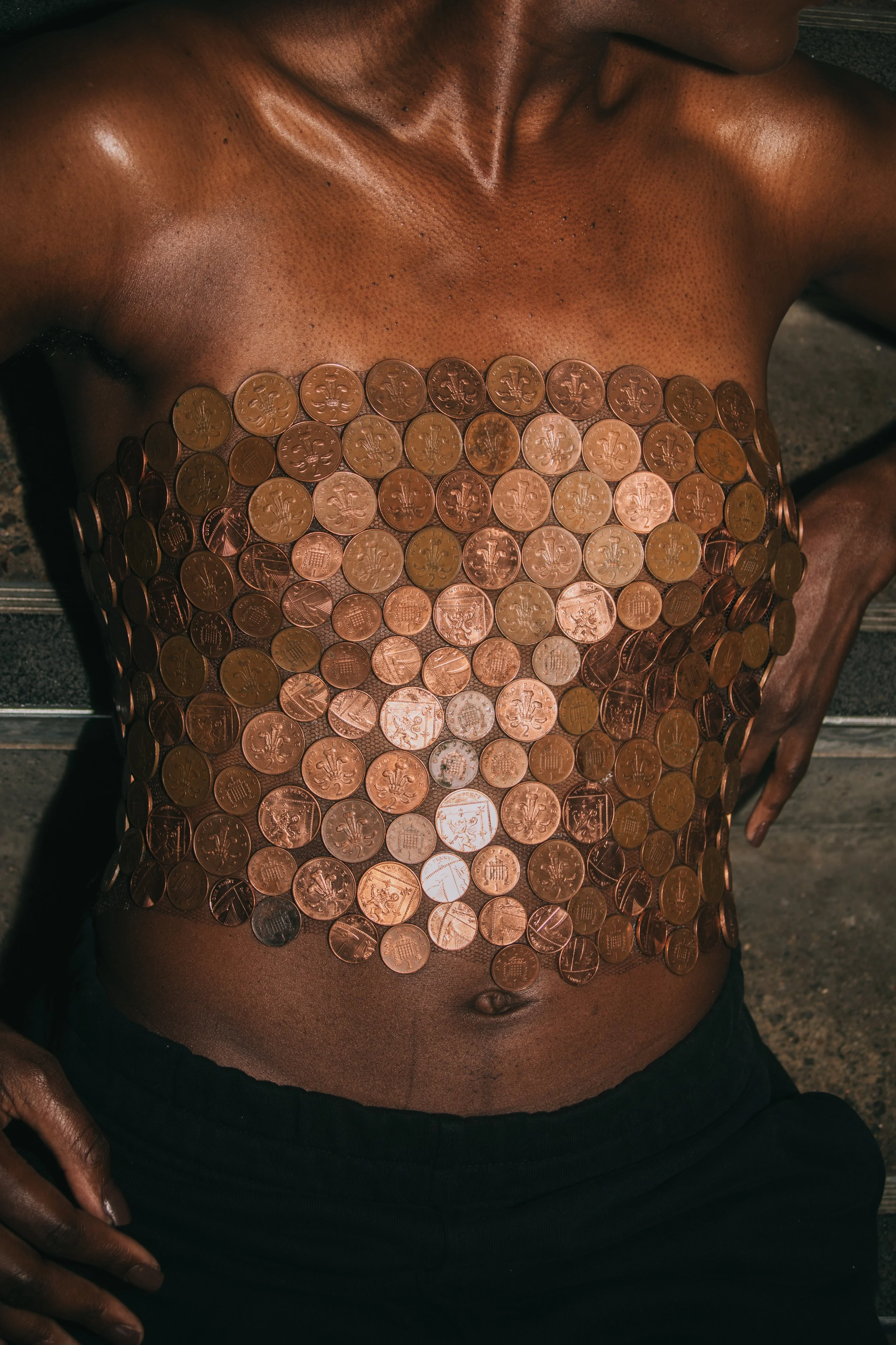 Inspired by tough times, the pennies armour represents the little protection women have when they have very little money. Weak, fragile and barely enough to shield her body from outside harm, this piece was made to show that fragile vulnerability through wear.